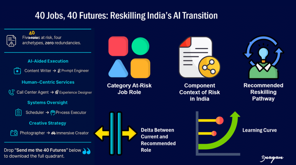 In this blog, 3nayan introduces a framework called “40 Futures”, a strategic map of 40 selected job roles in India most vulnerable to AI disruption, each paired with a reskilling pathway. These aren’t abstract predictions. They’re grounded in real-world transitions already underway, all the way from junior programmers becoming prompt engineers to retail cashiers evolving into experience hosts.