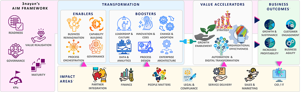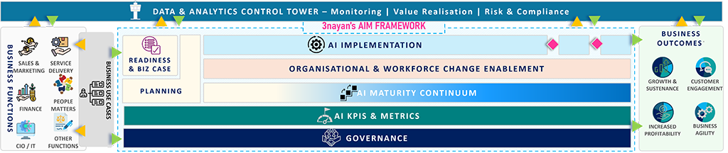 Transformation fails when strategy, execution, and measurement drift apart. 3nayan’s transformation practice uses the AIM Framework to integrate business, digital, and AI-led change under one coherent structure.