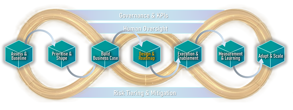 We translate ambition into measurable outcomes through AI roadmaps, readiness diagnostics, and maturity pathways that ensure every strategic decision is grounded in performance data and organisational capability.